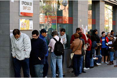Dòng người xếp hàng bên ngoài trung tâm giới thiệu việc làm ở thủ đô Ma-đrít của Tây Ban Nha. Ảnh: Guardian