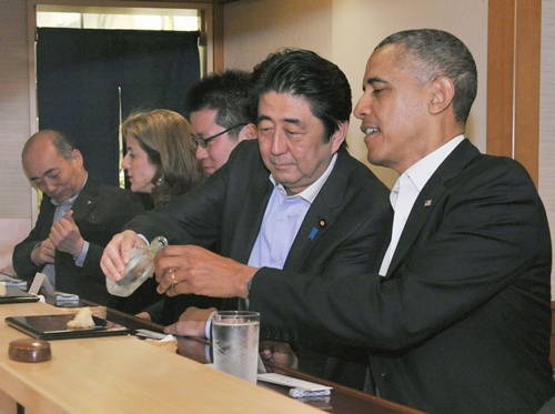 | Ông Obama và S.Abe tại một quán ăn ở Nhật Bản. Ảnh: NHK |