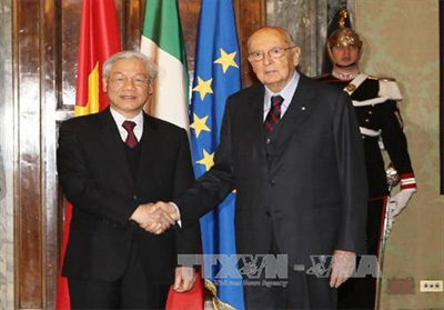 Tổng Bí thư Nguyễn Phú Trọng và Tổng thống Italia Giorgio Napolita. (Ảnh: Trí Dũng/TTXVN)