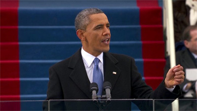 Phát biểu tại lễ nhậm chức, ông Obama kêu gọi người dân Mỹ đoàn kết vượt qua khó khăn để đưa đất nước phát triển. Ông cũng nhấn mạnh đến quyền tự do và bình đẳng cũng như những ưu tiên cho các vấn đề quốc nội và đường lối đối ngoại của Mỹ trong thời kỳ mới.