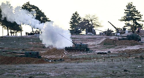 Quân đội Thổ Nhĩ Kỳ tại thị trấn Ki-lít của nước này nã pháo vào các mục tiêu lực lượng người Cuốc ở Xy-ri. Ảnh: AFP