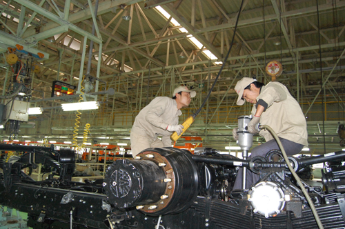 Người lao động trong các doanh nghiệp đang mong tăng lương từ ngày 1-1-2011 nhưng sẽ không tăng giá . Ảnh chụp tại Nhà máy ô tô VEAM Thanh Hóa.