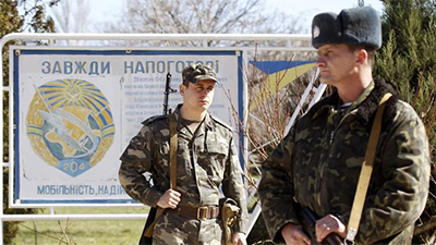 Binh sĩ U-crai-na đứng gác bên ngoài một căn cứ quân sự ở khu vực Liu-bi-mát-ca (Lyubimovka) của CH tự trị Crưm. Ảnh: Roi-tơ