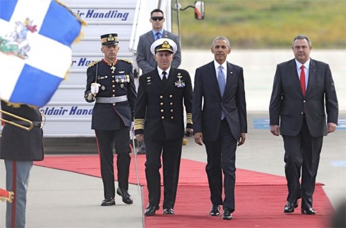 Tổng thống Ô-ba-ma (thứ hai, từ phải sang) đến A-then, bắt đầu chuyến công du Hy Lạp. Ảnh: AP