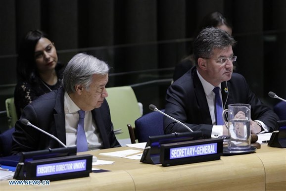 Ông Antonio Guterres (bên trái) tại cuộc thảo luận của Liên hợp quốc diễn ra ở New York ngày 23-5. Ảnh: Tân Hoa xã.
