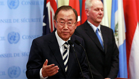 | Tổng thư ký LHQ Ban Ki Mun phát biểu về báo cáo của nhóm thanh sát viên LHQ về việc sử dụng vũ khí hóa học ở Xy-ri. Ảnh: Roi-tơ |