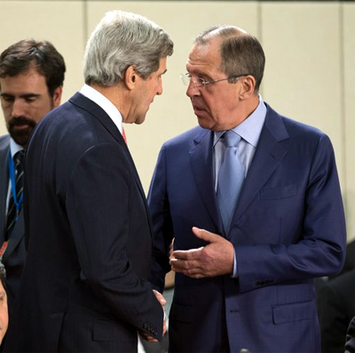 Ngoại trưởng Mỹ Giôn Ke-ri (bên trái) và Ngoại trưởng Nga Xéc-gây La-vrốp gặp gỡ trước thềm cuộc họp Hội đồng Nga-NATO tháng 4-2013. Ảnh: AP
