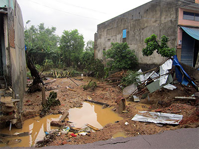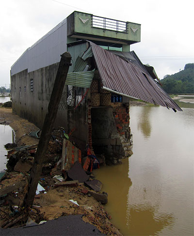 Đường liên huyện từ Quốc lộ 1A nối thị xã An Nhơn với huyện Tuy Phước bị lũ cuốn trôi hơn 100m làm sạt lở nhiều nhà dân.