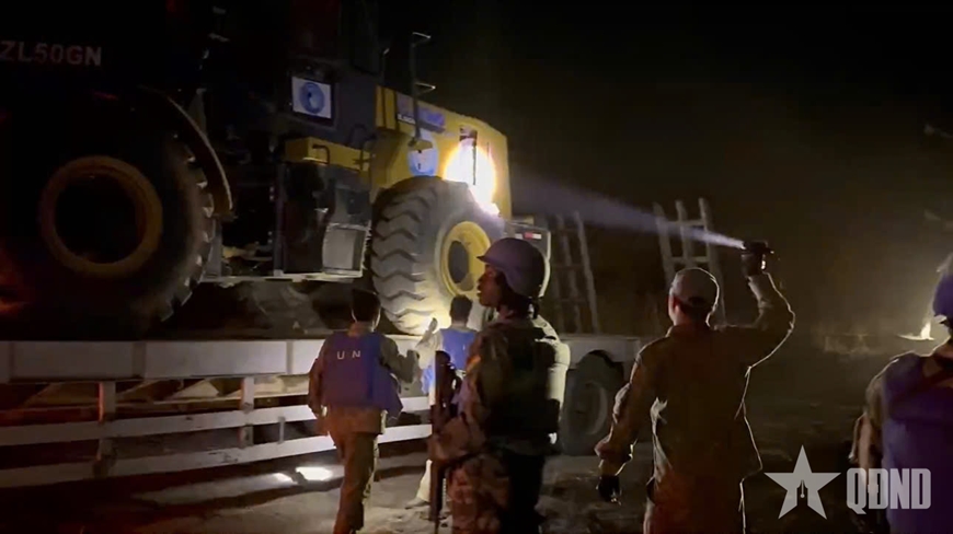 Vượt qua những cung đường ẩn chứa đầy rủi ro, dưới sự hộ tống nghiêm ngặt của Đơn vị Phản ứng nhanh Trung Quốc (CHN QRF) và Tiểu đoàn Ghana (GHANBATT), chuyến xe mang sứ mệnh mở đường của Việt Nam đã hạ tải thành công máy xúc vào lúc 2 giờ 30 phút sáng, kịp thời phục vụ công tác ứng phó khẩn cấp của Phái bộ.