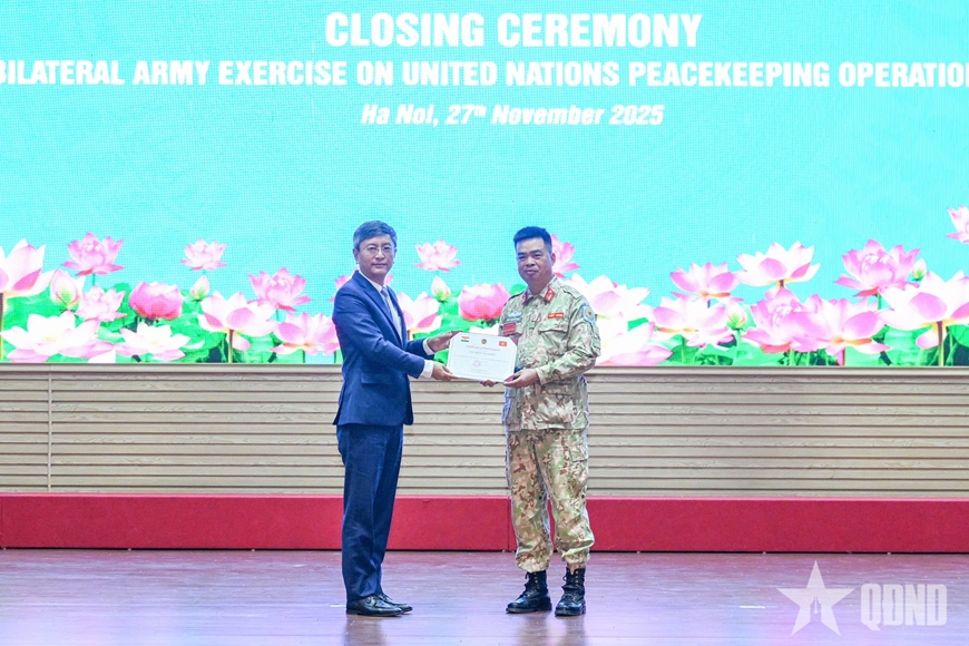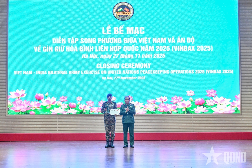 | Đại sứ Ấn Độ tại Việt Nam Tshering W. Sherpa trao Kỷ niệm chương và giấy chứng nhận diễn tập cho Trưởng đoàn Quân đội Việt Nam. |