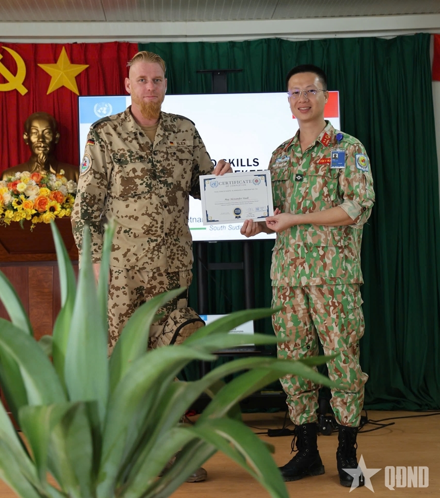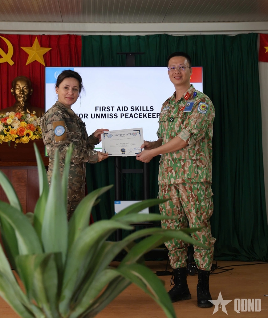 Trung tá Đinh Vũ Ngọc Ninh - Phó giám đốc chuyên môn Bệnh viện dã chiến cấp 2 số 7 Việt Nam trao chứng chỉ tốt nghiệp khóa huấn luyện cho học viên.