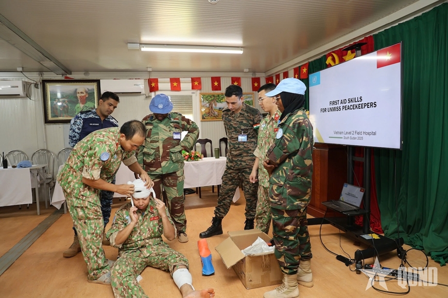 Trong tuần qua, tổ giảng viên gồm các y, bác sĩ của Bệnh viện dã chiến cấp 2 số 7 đã tổ chức các lớp huấn luyện chuyên ngành y tế về sơ cứu ban đầu và hồi sức tim phổi nâng cao cho các đối tượng là sĩ quan gìn giữ hòa bình thuộc các cơ quan, phòng, ban của Sở Chỉ huy Phân khu Unity.