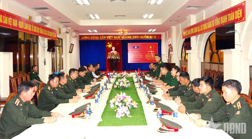 Thượng tá Đào Hùng Mạnh, Phó chánh Văn phòng Binh đoàn 15 và Trung úy Phết Sạ Vẳn Chăn Thạ Vông, Trợ lý Ban chuyên gia - Học viên Cục Đối ngoại Lào trao biên bản bàn giao.