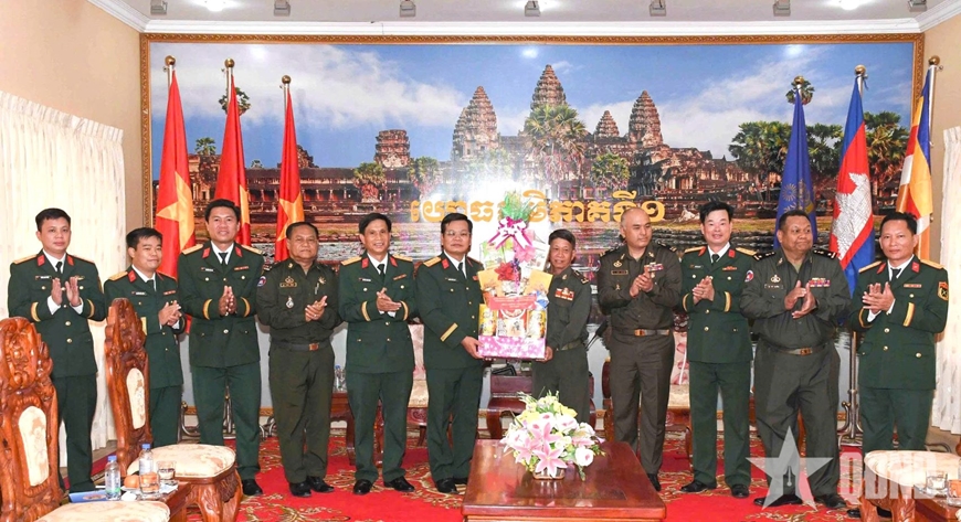 Đại tá Nguyễn Hồng Lam, Phó tư lệnh Binh đoàn 15 và đoàn công tác đến thăm, chúc Tết Bộ tư lệnh Quân khu 1, Quân đội Hoàng gia Campuchia.