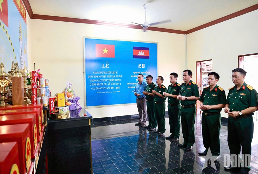 | Đoàn công tác Binh đoàn 16 dâng hương tưởng niệm các liệt sĩ Quân tình nguyện Việt Nam hy sinh tại Campuchia. |