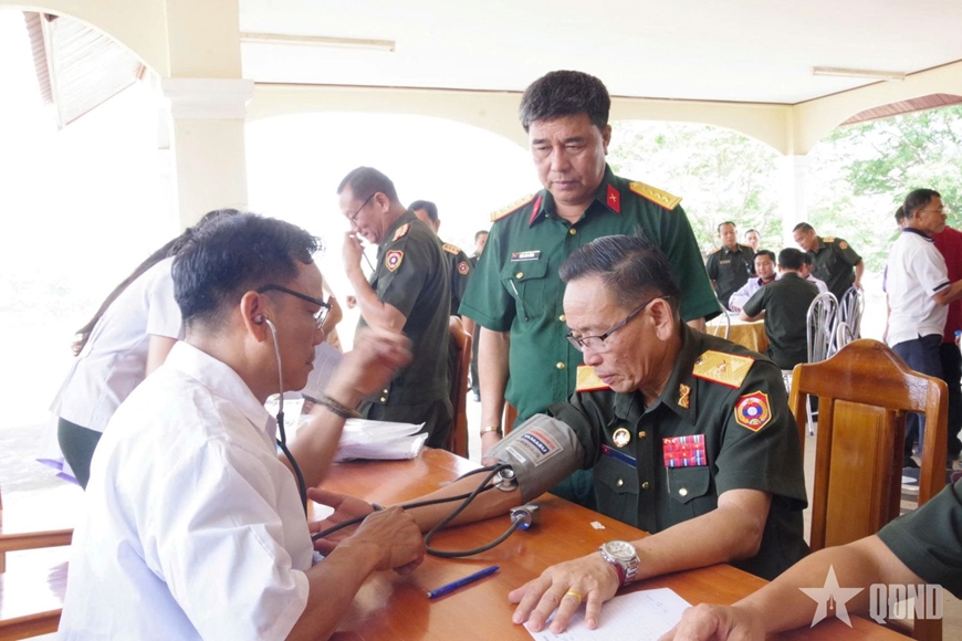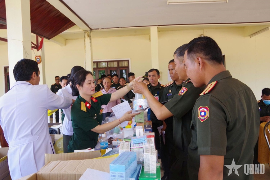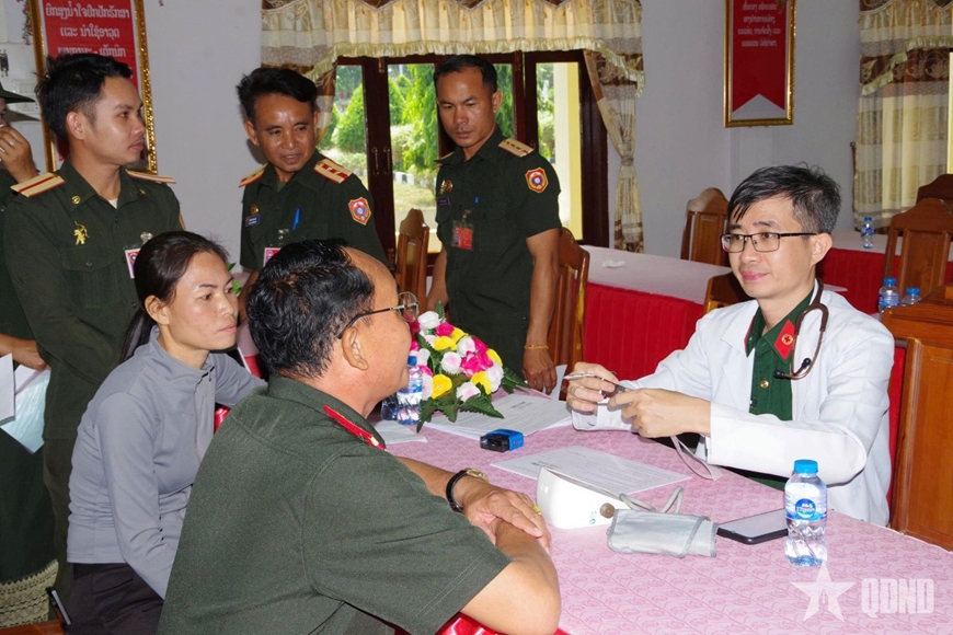 | Đoàn công tác khám bệnh, cấp thuốc miễn phí cho cán bộ, chiến sĩ Sư đoàn Bộ binh 5, Quân đội nhân dân Lào. |