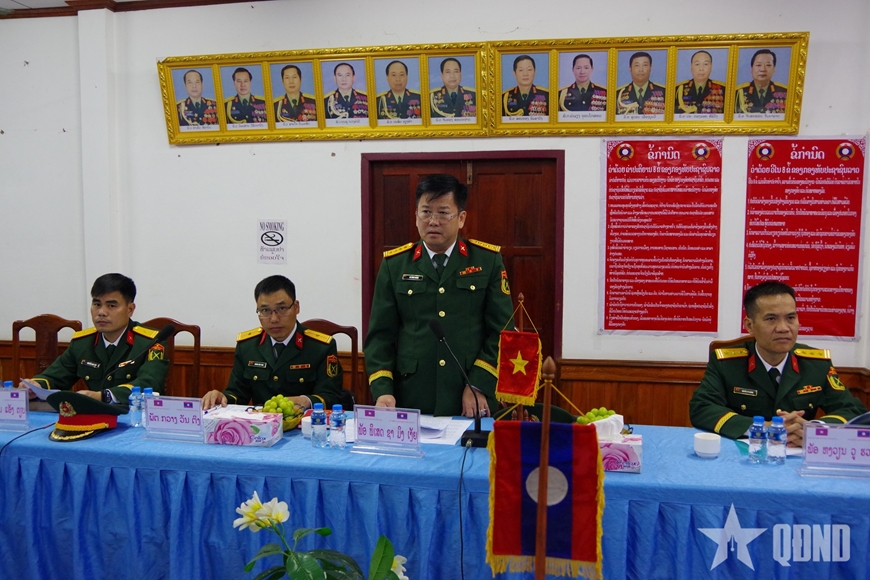 Đại tá Sa Minh Nghĩa, Chính ủy Bộ CHQS tỉnh Sơn La phát biểu tại hội nghị giao ban định kỳ với Bộ CHQS tỉnh Oudomxay.