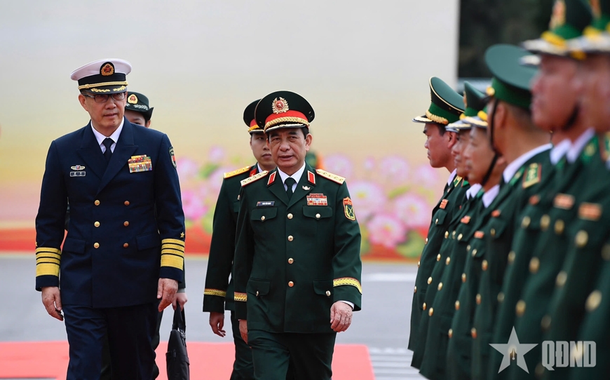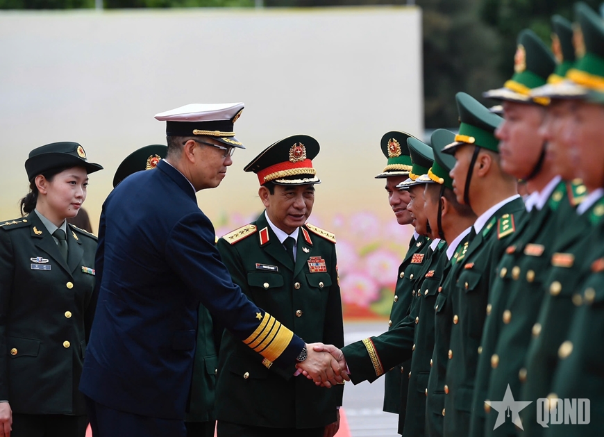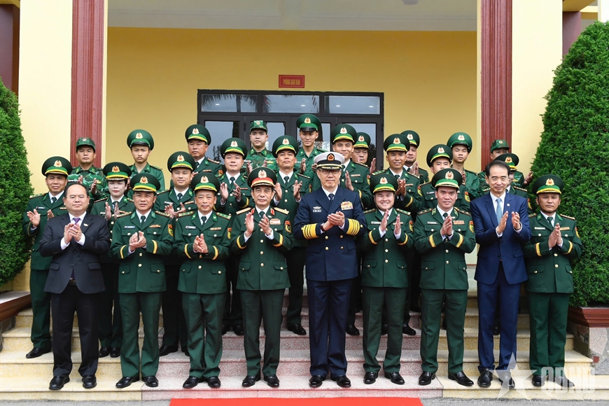 | Bộ trưởng Bộ Quốc phòng hai nước và các đại biểu chụp ảnh chung với cán bộ, chiến sĩ Đồn Biên phòng Trà Cổ. |