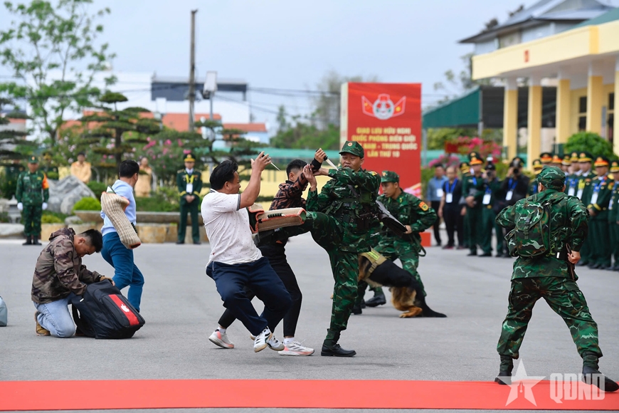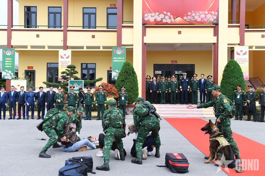 | Đại tướng Phan Văn Giang và Thượng tướng Đổng Quân chứng kiến các chiến sĩ Biên phòng thực hiện một tình huống nghiệp vụ phát hiện và bắt giữ tội phạm ma túy. |