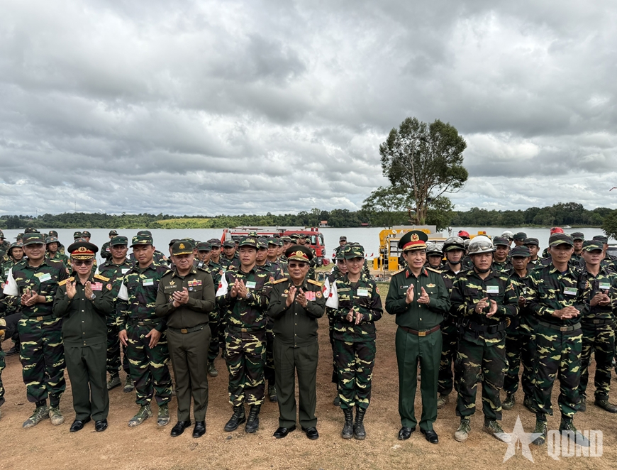 Đại tướng Chansamone Chanyalath và Bộ trưởng Quốc phòng Việt Nam - Lào - Campuchia dự Diễn tập cứu hộ, cứu nạn chung giữa Quân đội ba nước. |