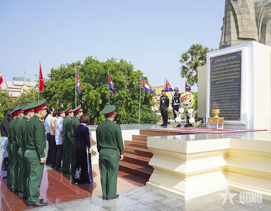Trước đó, đoàn công tác của Bộ tư lệnh TP Hồ Chí Minh đã đến dâng hoa, dâng hương viếng Đài hữu nghị Việt Nam - Campuchia tại Thủ đô Phnom Penh.