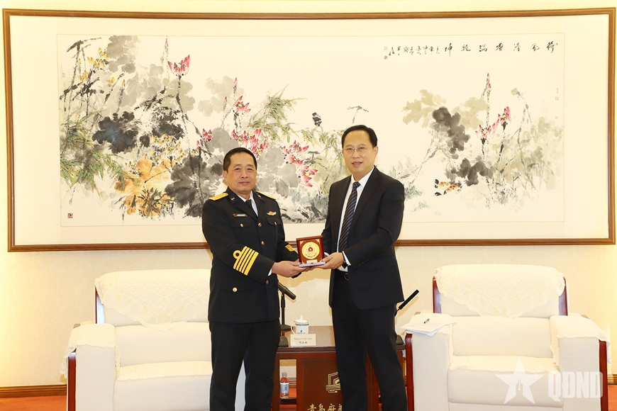 Đại tá Nguyễn Vĩnh Nam trao quà lưu niệm tặng đồng chí Khương Lâm, Phó tổng thư ký chính quyền thành phố Thanh Đảo.