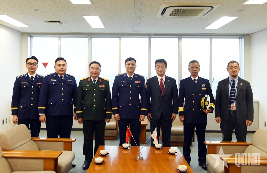 | Đoàn công tác Cảnh sát biển Việt Nam và Cục Cảng biển và Sân bay thành phố Fukuoka chụp ảnh lưu niệm. |