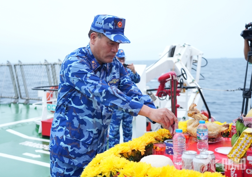 | Đại tá Lương Cao Khải, Phó tư lệnh, Tham mưu trưởng Vùng Cảnh sát biển 1 dâng hương tưởng niệm các anh hùng liệt sĩ và ngư dân tử nạn. |