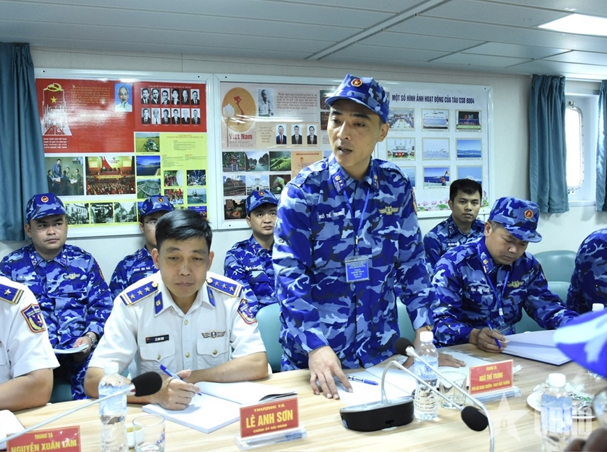 | Trung tá Ngô Thế Trung, Phó hải đoàn trưởng, Tham mưu trưởng Hải đoàn 11, Bộ tư lệnh Vùng Cảnh sát biển 1 báo cáo về tình hình chuẩn bị cho chuyến tuần tra liên hợp. |