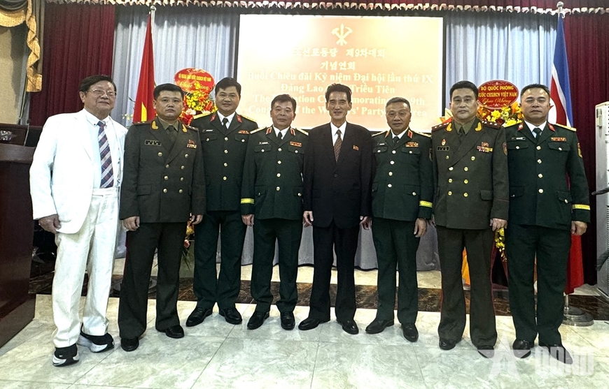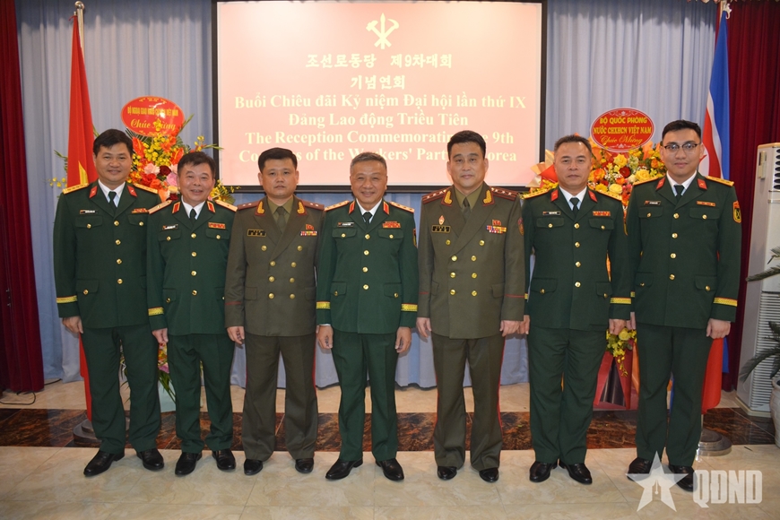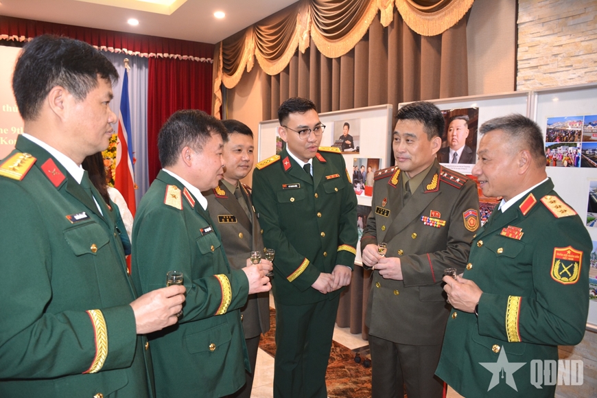 | Thượng tướng Lê Quang Minh chụp ảnh cùng Tùy viên, Phó tùy viên Quốc phòng Triều Tiên và các đại biểu Bộ Quốc phòng Việt Nam. |