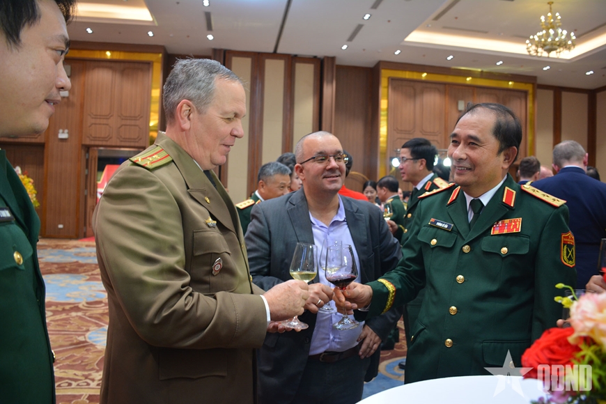 | Thượng tướng Hoàng Xuân Chiến trao đổi với các vị khách quốc tế dự chiêu đãi. |