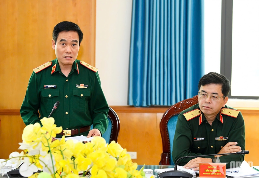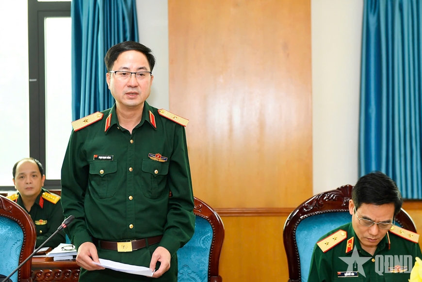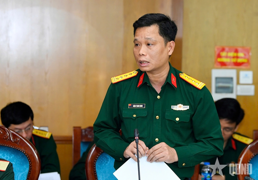 | Đại tá Nguyễn Hồng Giang, Phó tư lệnh, Tham mưu trưởng Binh chủng Công binh phát biểu ý kiến. Ảnh: TUẤN HUY |