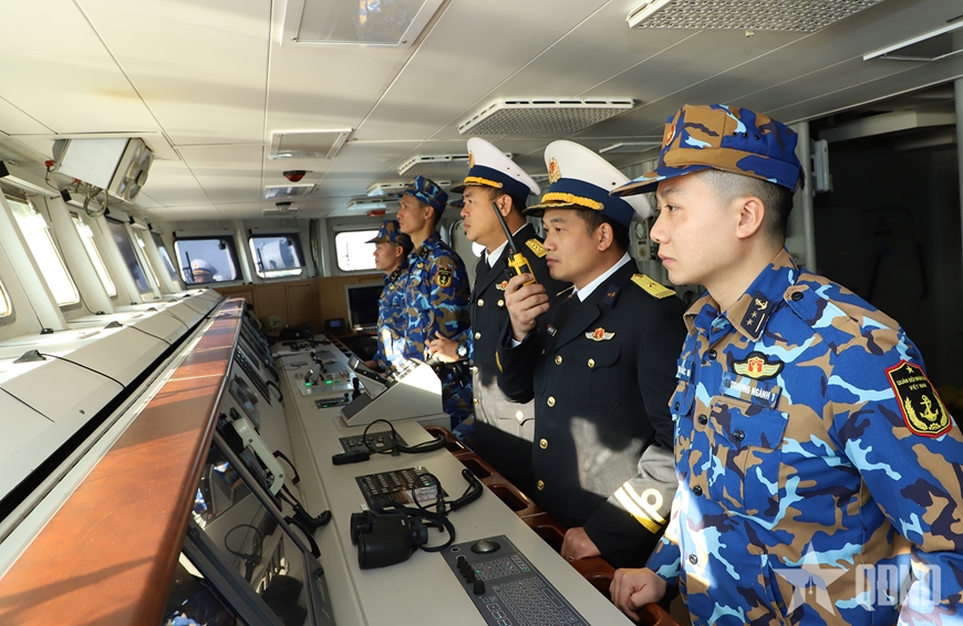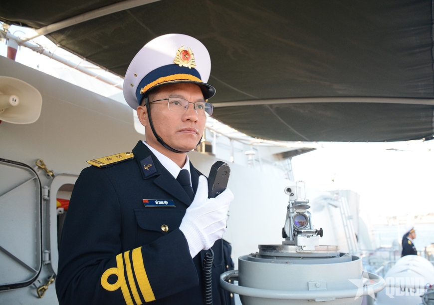 | Trung tá Đỗ Xuân Tiệp, Thuyền trưởng Tàu 015-Trần Hưng Đạo chỉ huy tàu rời bến. |