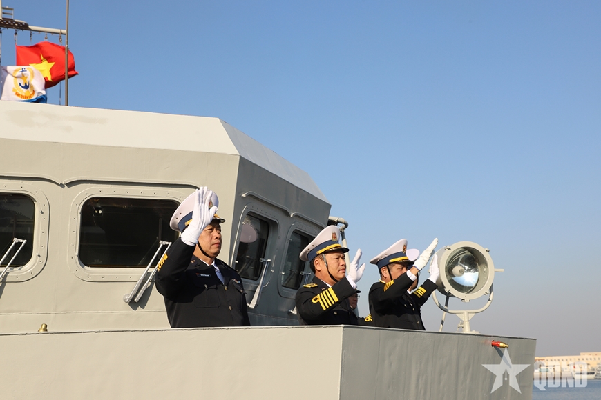 | Đoàn công tác và cán bộ, thủy thủ Tàu 015-Trần Hưng Đạo chào cảng. |