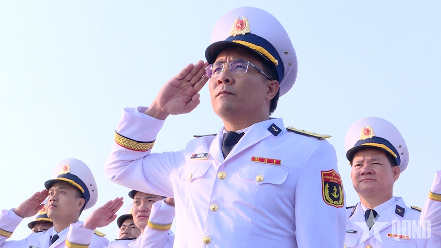 Giữa trùng khơi Ấn Độ Dương, lễ chào cờ diễn ra trong không khí trang nghiêm. Khi Quốc ca Việt Nam vang lên, từng cán bộ, chiến sĩ đứng nghiêm chào cờ, ánh mắt hướng về lá cờ Tổ quốc. Khoảnh khắc thiêng liêng ấy như gói trọn niềm tự hào, ý chí và tình yêu đất nước giữa muôn trùng sóng gió.