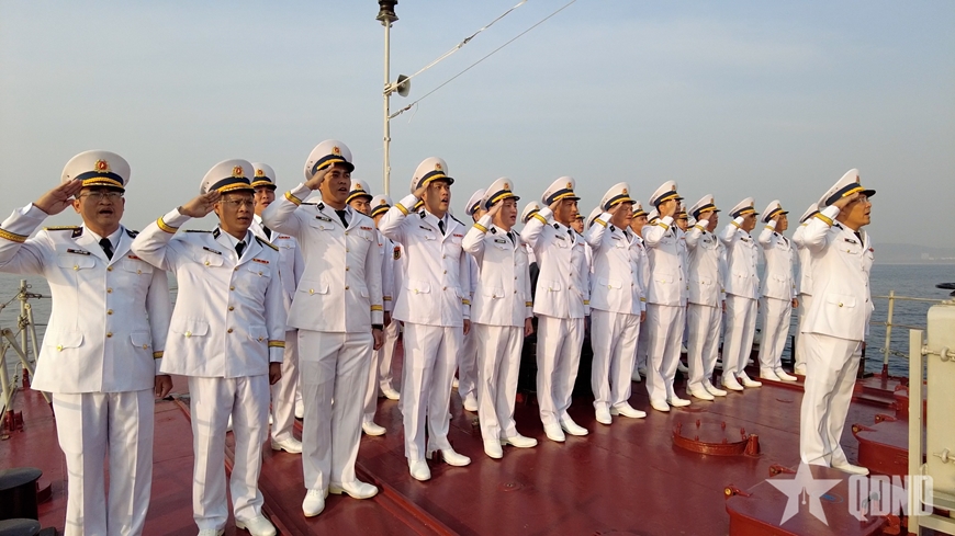 | Cán bộ, sĩ quan trên Tàu 17 tham gia Lễ chào cờ trang nghiêm trên boong tàu. |