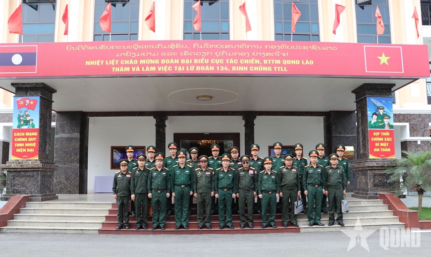 | Thủ trưởng Binh chủng Thông tin liên lạc và Chỉ huy Lữ đoàn 134 chụp ảnh lưu niệm với Đoàn công tác Cục Tác chiến, Bộ Tổng Tham mưu Quân đội nhân dân Lào. |