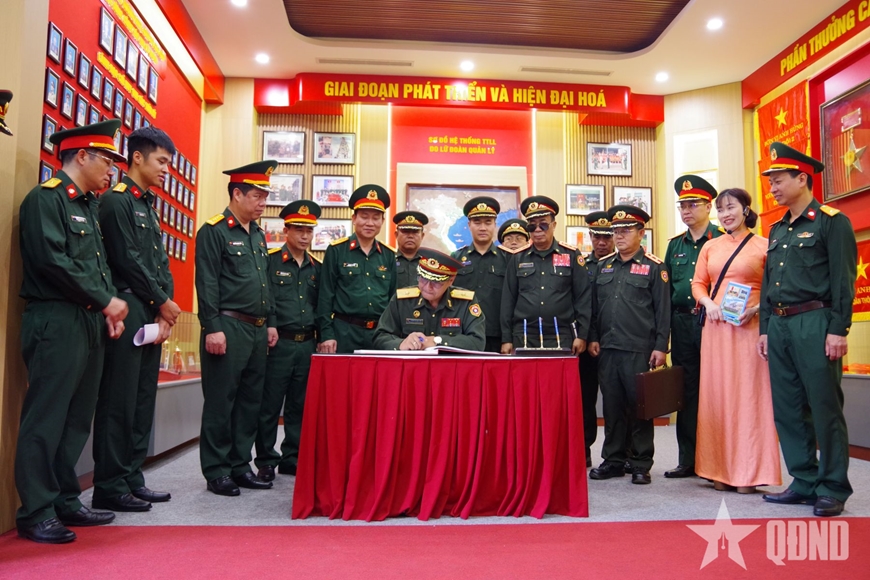 | Thiếu tướng Thongsamay Soukpasot ghi sổ lưu niệm tại Nhà truyền thống của Lữ đoàn 134. |