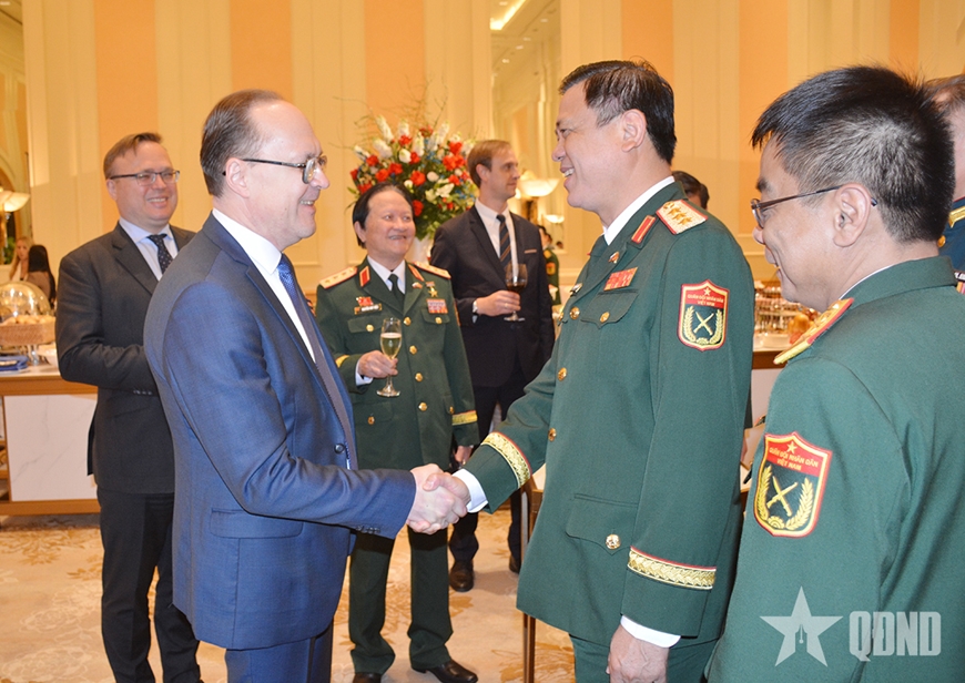 | Thượng tướng Nguyễn Trường Thắng trao đổi với Đại sứ và Tùy viên Quốc phòng Nga. |