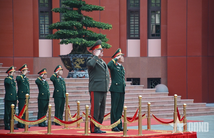 Đại tướng Nguyễn Tân Cương và Thiếu tướng Pavel Muraveiko duyệt Đội danh dự Quân đội nhân dân Việt Nam.