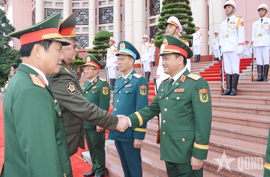 Đại tướng Nguyễn Tân Cương đón Thiếu tướng Pavel Muraveiko.
