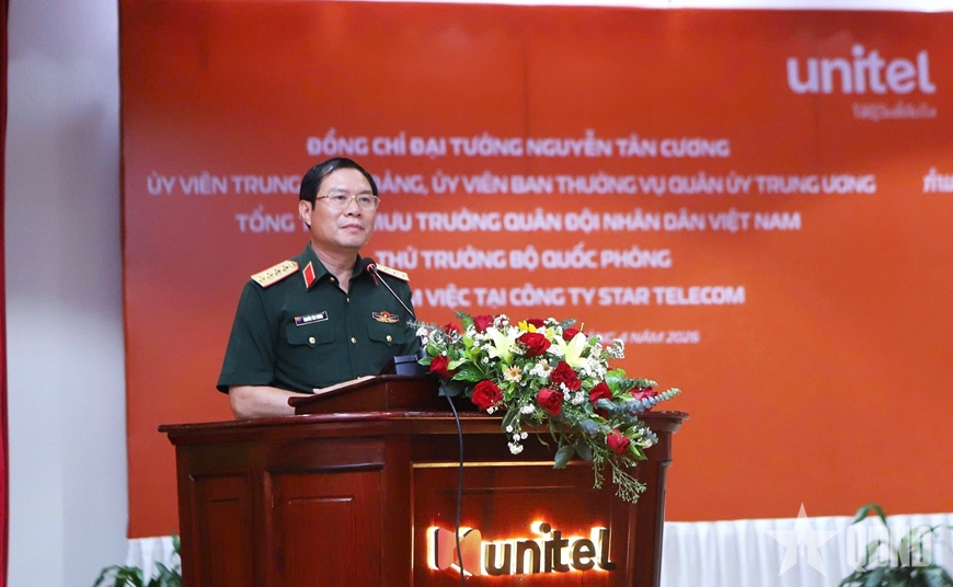| Đại tướng Nguyễn Tân Cương phát biểu khi đến thăm Công ty Star Telecom. |