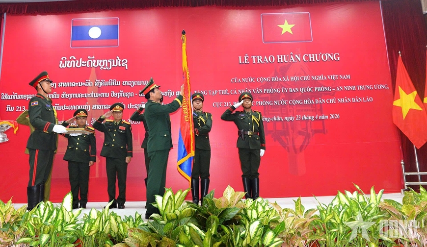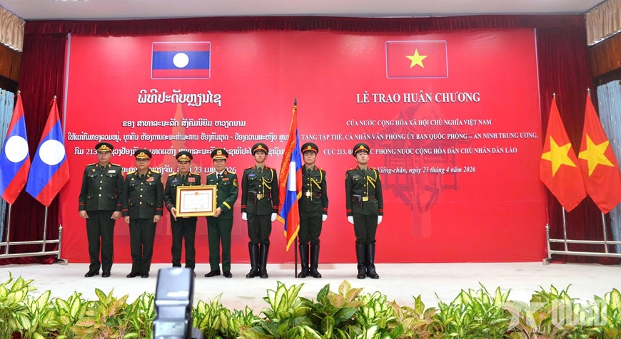 | Thừa ủy quyền của Chủ tịch nước Cộng hòa xã hội chủ nghĩa Việt Nam, Đại tướng Nguyễn Tân Cương trao Huân chương của Nhà nước Việt Nam tặng các tập thể và cá nhân thuộc Bộ Quốc phòng Lào. |