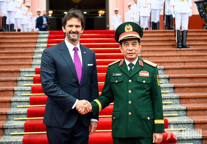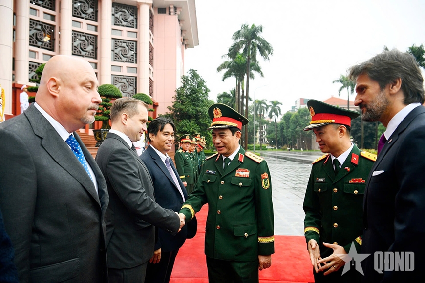 Đại tướng Phan Văn Giang đón Phó thủ tướng, Bộ trưởng Bộ Quốc phòng Slovakia Robert Kalinak. Ảnh: TUẤN HUY