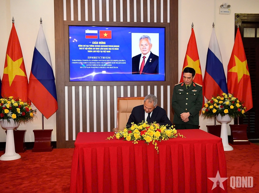 | Thư ký Hội đồng An ninh LB Nga Sergey Shoigu ghi sổ lưu niệm tại trụ sở Bộ Quốc phòng Việt Nam. |