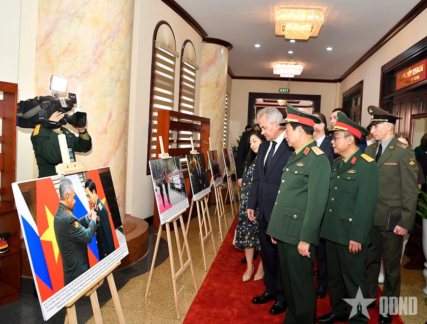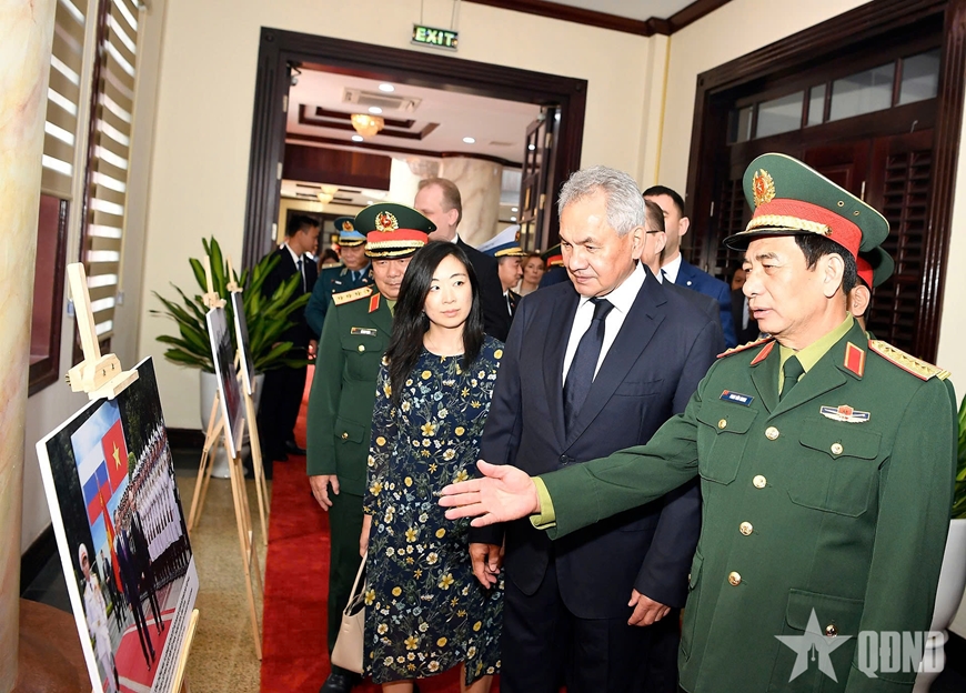 | Đại tướng Phan Văn Giang và Thư ký Hội đồng An ninh LB Nga Sergey Shoigu xem trưng bày ảnh về quan hệ hai nước. |