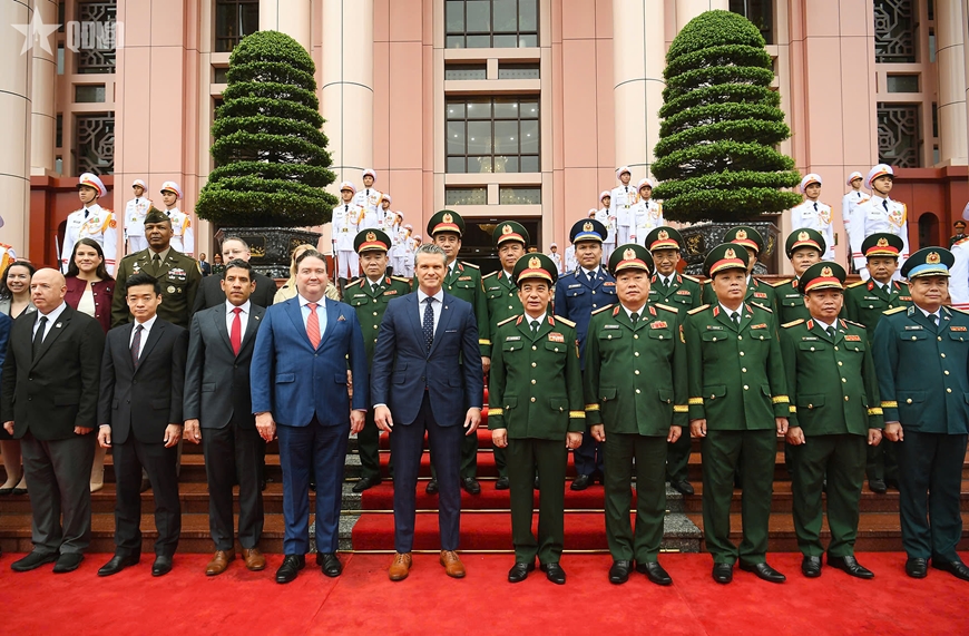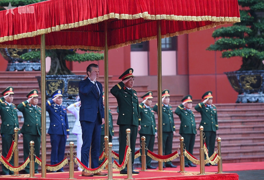 | Bộ trưởng Phan Văn Giang chủ trì lễ đón Bộ trưởng Pete Hegseth. Ảnh: TUẤN HUY |