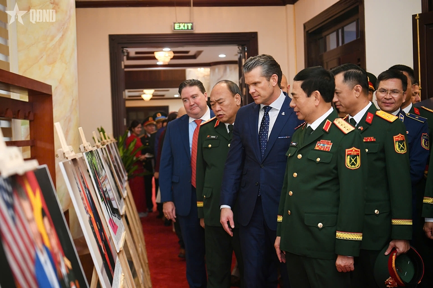 | Hai Bộ trưởng tham quan trưng bày ảnh về quan hệ Việt Nam-Hoa Kỳ và hợp tác quốc phòng song phương. Ảnh: TUẤN HUY |