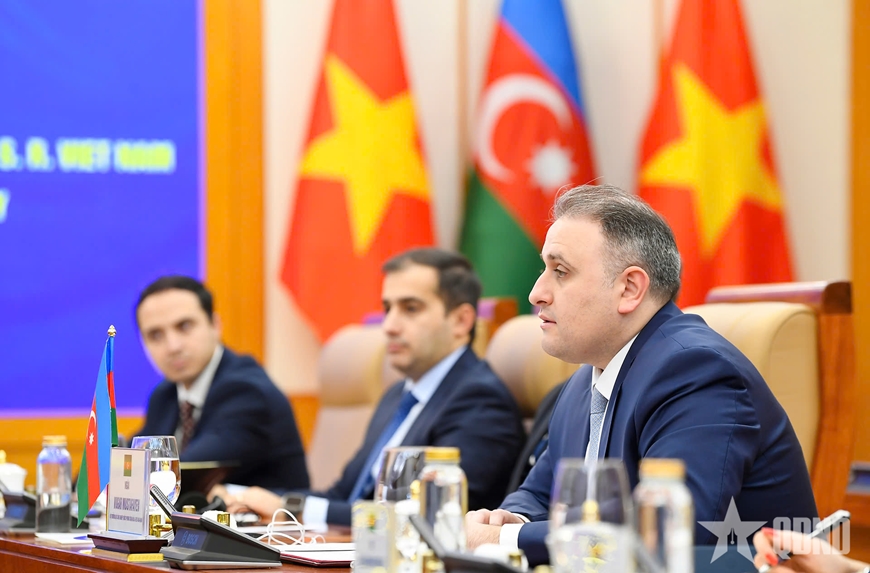 | Bộ trưởng Vugar Mustafayev và các thành viên đoàn đại biểu Azerbaijan tại hội đàm. Ảnh: TUẤN HUY |