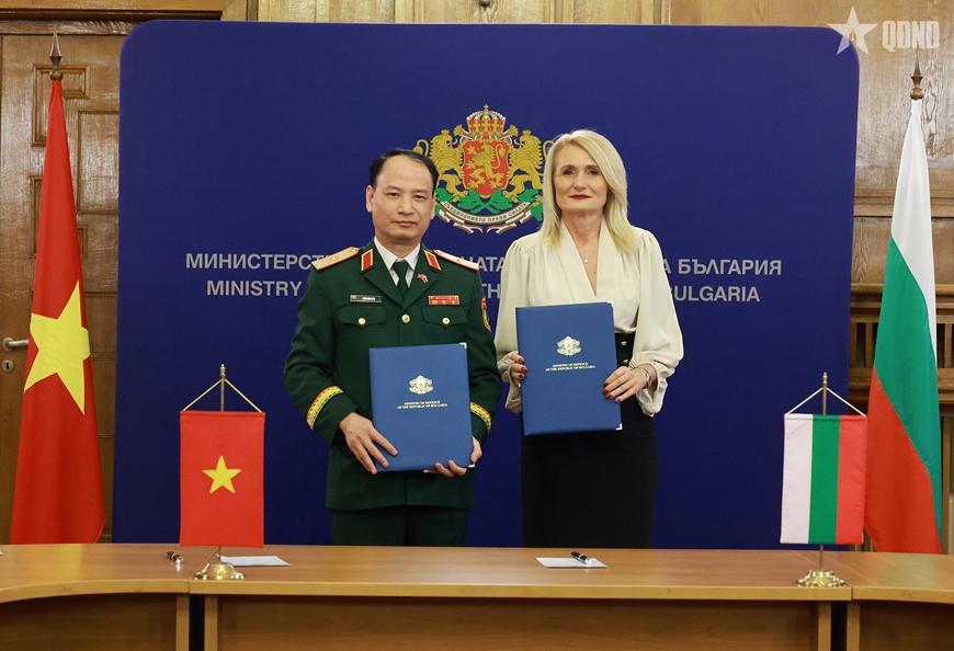 Thiếu tướng Trần Đình Thọ, Cục trưởng Cục Cán bộ, Tổng cục Chính trị Quân đội nhân dân Việt Nam và bà Tatyana Aleksandrova, Giám đốc điều hành Câu lạc bộ quân đội và nghỉ dưỡng, Bộ Quốc phòng Bulgaria, ký Phụ lục thỏa thuận giữa Bộ Quốc phòng hai nước về trao đổi đoàn tham quan, nghỉ dưỡng. |